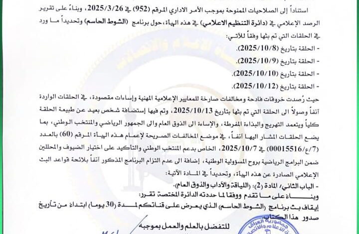 هيئة الإعلام والاتصالات – CMC تقرر إيقاف برنامج (الشوط الحاسم)