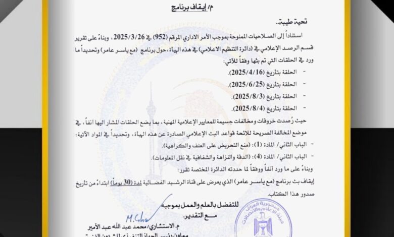 هيئة الإعلام والاتصالات – CMC تقرر ايقاف برنامج مع ياسر عامر الذي يعرض على شاشة قناة الرشيد الفضائية لمدة ٣٠ يوم