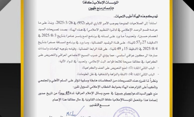 هيئة الإعلام والاتصالات – CMC تقرر منع ظهور المدعو عصام حسين في جميع وسائل الإعلام العراقية ولمدة ٤٥ يوم