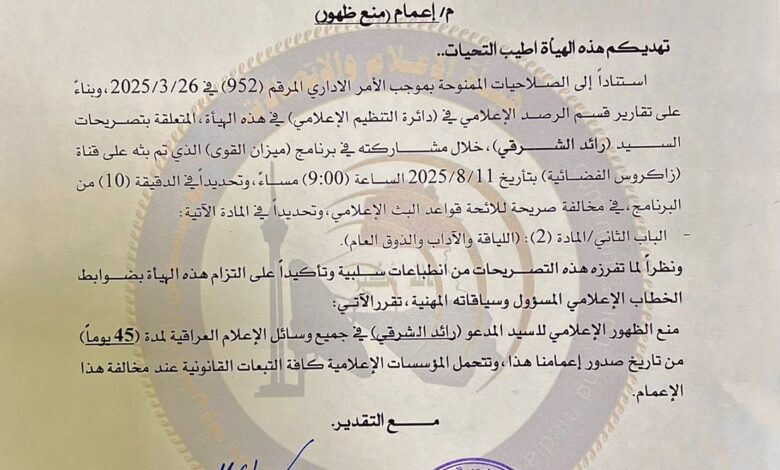 هيئة الاعلام والاتصالات تقرر منع ظهور السيد رائد الشرقي على كافة سائل الاعلام العراقية ولمدة ٤٥ يوم