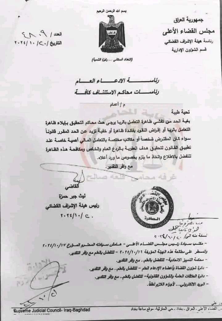 مجلس القضاء الاعلى يوجه محاكم التحقيق بإيلاء ظاهرة التعامل بالربا